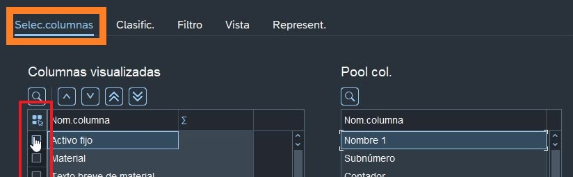 2. Elegimos en la parte superior Selecc. columnas, en la parte inferior se pueden elegir cuales columnas se desean ver en el reporte.